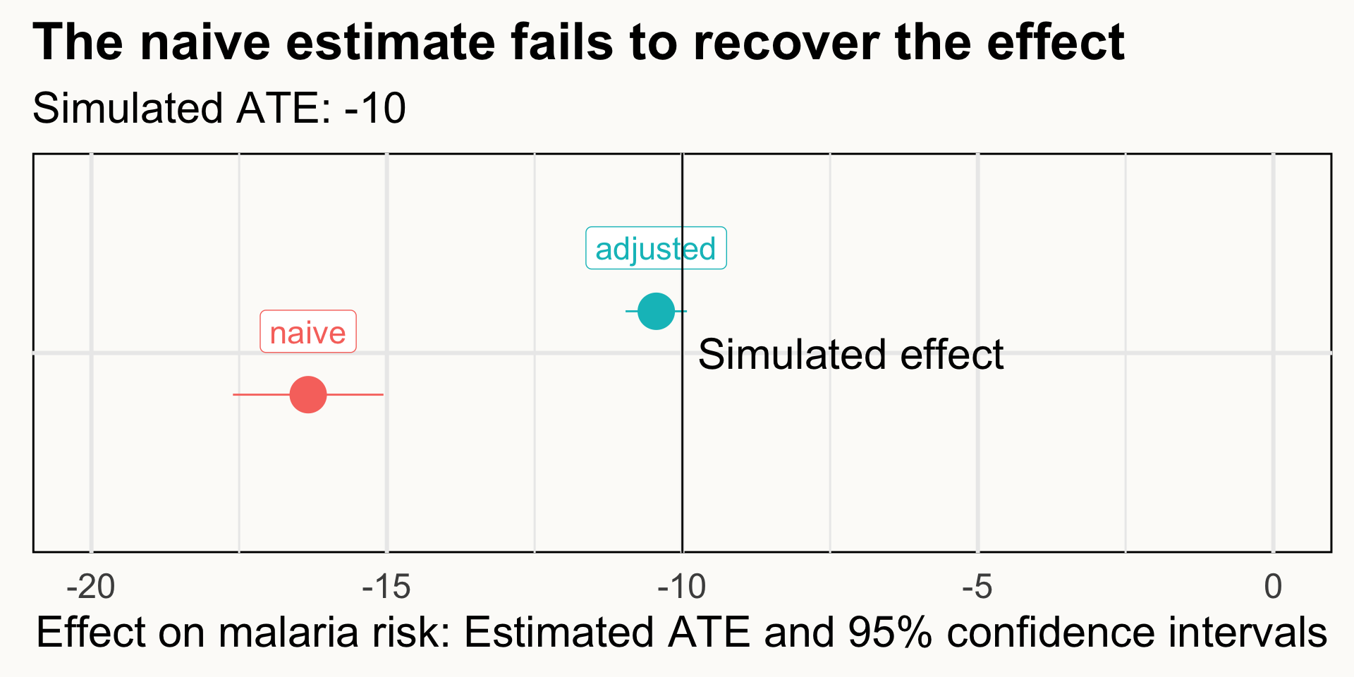 Heiss simulated data from 1,752 households to show that mosquito nets cause a reduction in malaria risk of 10 points.