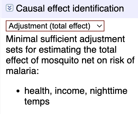 This tells us that we only need to control for health, income, and nighttime temps to identify our causal effect of interest (nets -> malaria risk). We see the same on DAGitty.net.