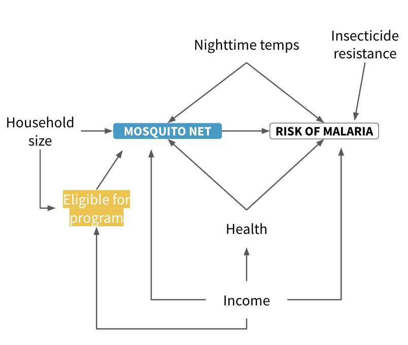 [2] "\"mosquito net\" <- \"eligible for program\" <- income -> \"risk of malaria\""
